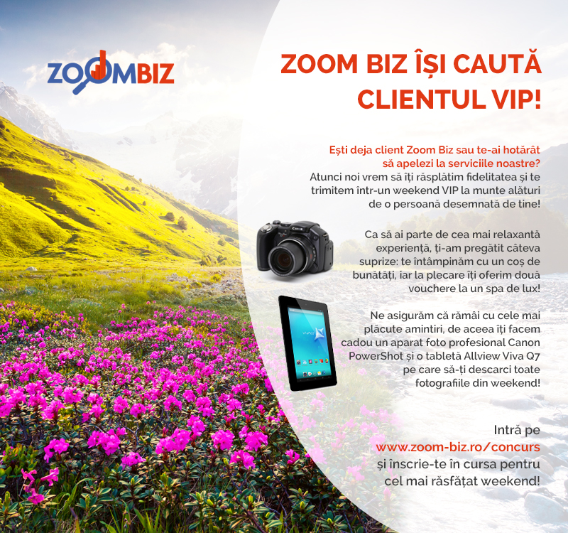– Organizatorul concursului ” Zoom-Biz își caută clientul VIP “ este S.C.Zoom-Biz S.R.L., cu sediul în Bucuresti, Intrarea Platon, nr.5, sector 3, pagină web: www.2biz.ro, e-mail: contact@2biz.ro înregistrată la Registrul Comerțului sub nr. J40/2090/2014, având cod fiscal RO29274179, număr de telefon 0740.181.247