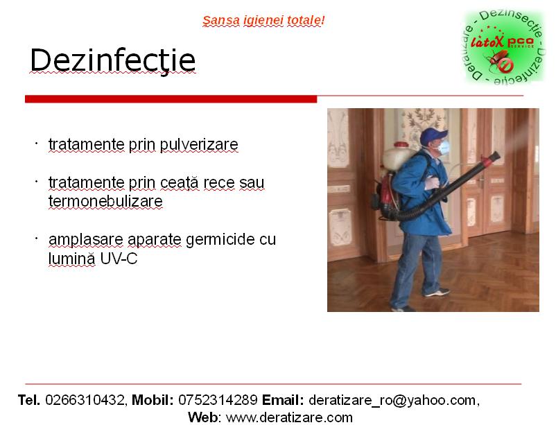 Dezinfectia este un serviciu in care societatea noastra are o exeperienta foarte bogata si pentru asta atunci cand intampinati o problema legata de dezinfectie puteti apela cu incredere la serviciile noastre alaturi de o echipa profesionista. Cu ajutorul nostru scapati de toate boliile infectioase si parazitare care pot fi dunatoare omului prin actiunea de exterminare a germenilor patogeni.