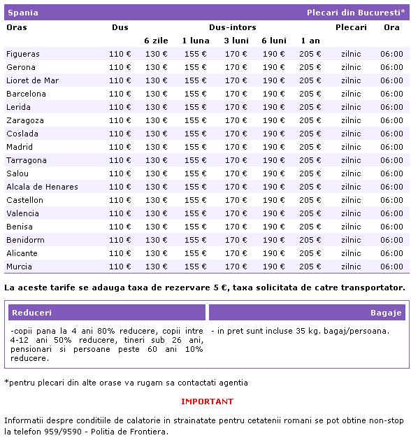 Agentia Eurotrafic va pune la dispozitie autocare moderne, dotate pentru plecari in Spania. Plecarile se fac din Bucuresti. Agentia va ofera reduceri de pana la 80% pentru copiii sub 4 ani, copiii intre 4 si 12 ani beneficiaza de 50% reducere, iar tinerii pana in 26 ani si persoanele peste 60 de ani au o reducere de 10%. Pentru mai multe detalii accesati butonul info.