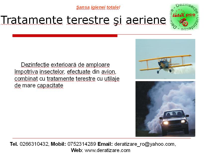 Firma Latox Pco service va ofera servicii de dezinfectie terestre si aeriene. Acesta sunt efectuate cu ajutorul avioanelor si a masinilor de mare capacitate. Tratamentele se realizeaza impotriva insectelor si a daunatorilor nedoriti. Substantele folosite nu afecteaza omul si animalele. Apelati cu incredere la echipa noastra de profesionisti si in cel mai scurt timp posibil problemele se vor rezolva.